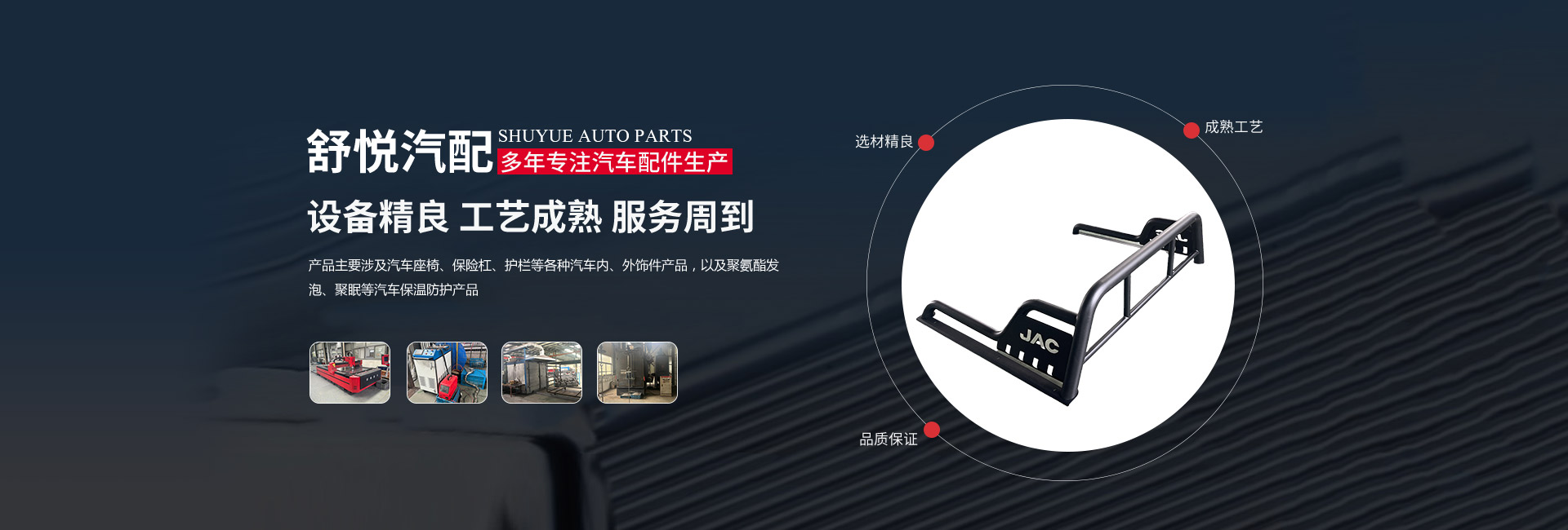 揚州舒悅汽配有限公司經(jīng)過多年的穩(wěn)定發(fā)展,業(yè)績一直蒸蒸日上。公司產(chǎn)品主要涉及汽車座椅、保險杠、護欄等各種汽車內(nèi)、外飾件產(chǎn)品,以及聚氨酯發(fā)泡、聚脲等汽車保溫防護產(chǎn)品。其主要是為江淮、金龍,奇瑞等公司服務,已連續(xù)多年成為江淮、金龍等公司的A級供應商。        公司成立于1997年,現(xiàn)坐落于揚州市儀征劉集盤古工業(yè)集中區(qū)202號,公司占地面積26640平 方米,廠房建筑面積18512平方米。公司擁有先進的制造設備、可靠的生產(chǎn)工藝、完善的檢測手段和科學的管理,在售前和售后服務中做到快速反應,應急應變,為客戶提供優(yōu)良產(chǎn)品和滿意服務。公司的產(chǎn)品開發(fā)能力和生產(chǎn)規(guī)模在同行業(yè)中處于前列的地位。        揚州舒悅?cè)吮小罢\信雙嬴”的原則,發(fā)揚“誠信、務實、創(chuàng)新、貢獻”的企業(yè)精神,恪守“顧客至上”的經(jīng)營宗旨,致精從業(yè),不斷引進新技術、新材料。以優(yōu)良的產(chǎn)品、合理的價格和周到的服務參與市場競爭。公司愿與國內(nèi)外朋友建立真誠的合作伙伴關系,攜手共創(chuàng)輝煌!